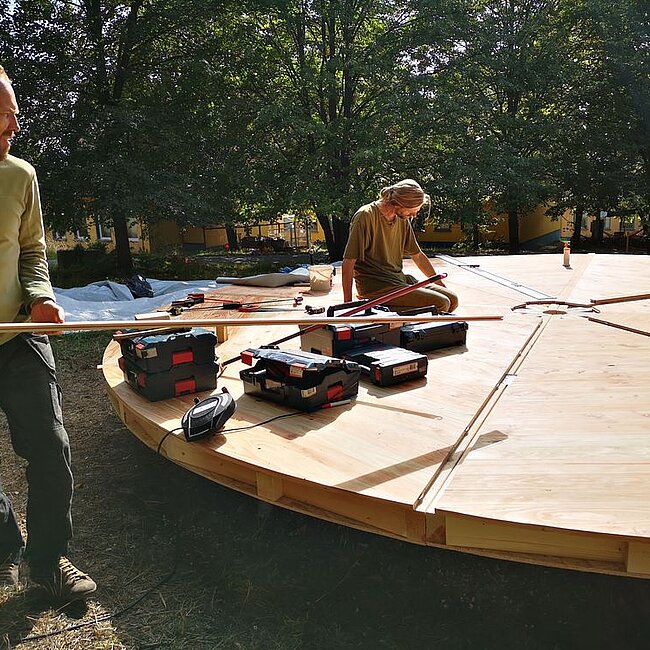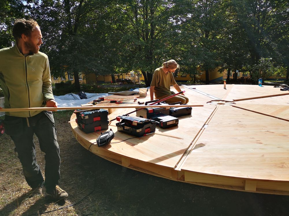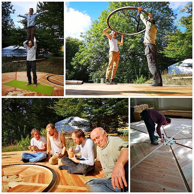 ...und wir bauten einen Holzboden für die Schuljurte... Tortenstückprinzip... ausgefuchst.