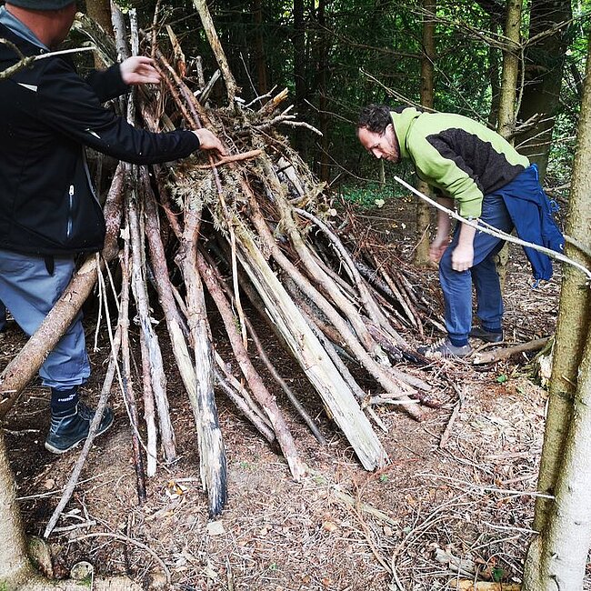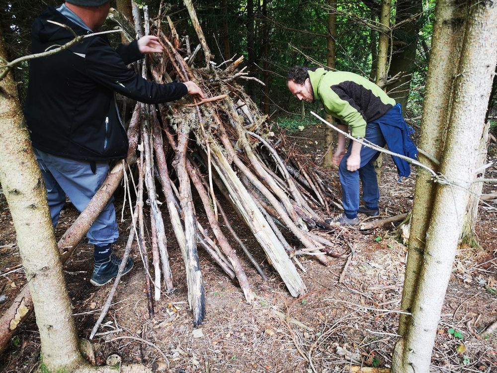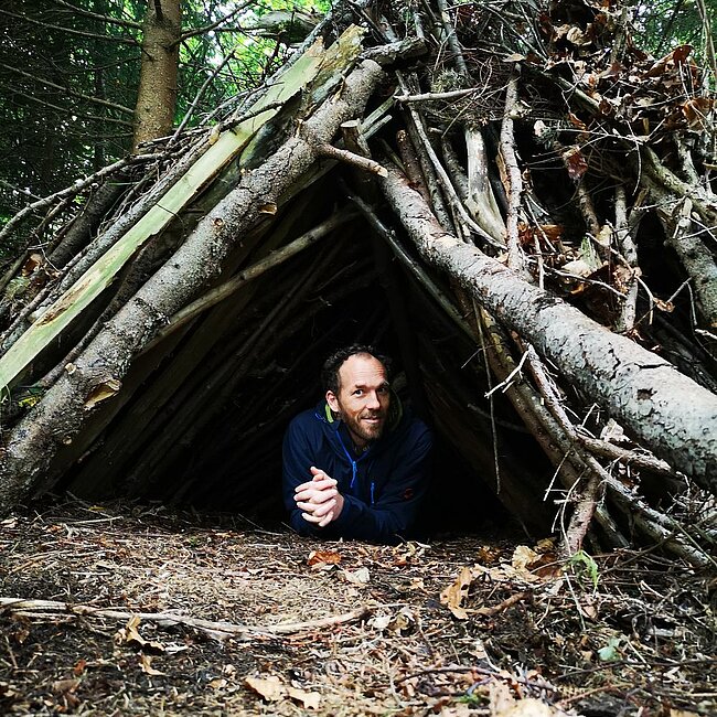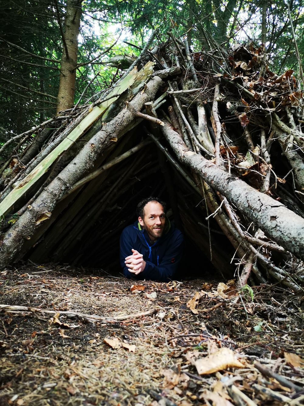 Survivaltraining im Wald in der Schweiz mit unserem Freund Gion Saluz. Hier bauen wir eine Shelter zum Schutz vor Wind und Regen.