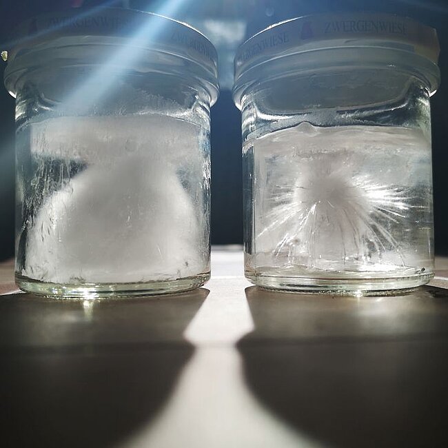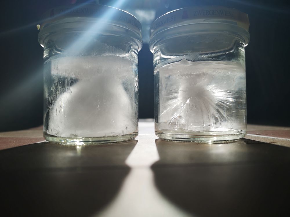 Die uns kennen, wissen, gutes Wasser ist uns wichtig. Hier mal ein Vergleich ... links Leitunsgwasser gefroren -> trüb,irgendwie klumpig und rechts unser Filterwasser gefroren -> strukturiert, klar und irgendwie schön :)