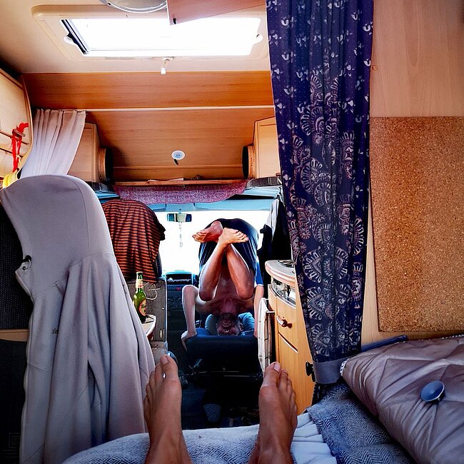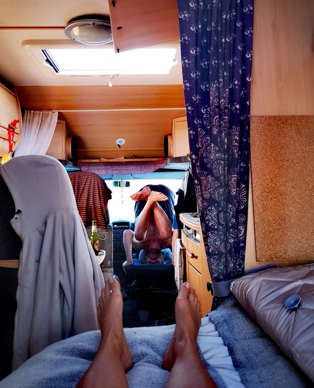 Auf engem Raum im Womo. Man wird kreativ. Witziger Anblick. Und optimal genutzter Raum;)