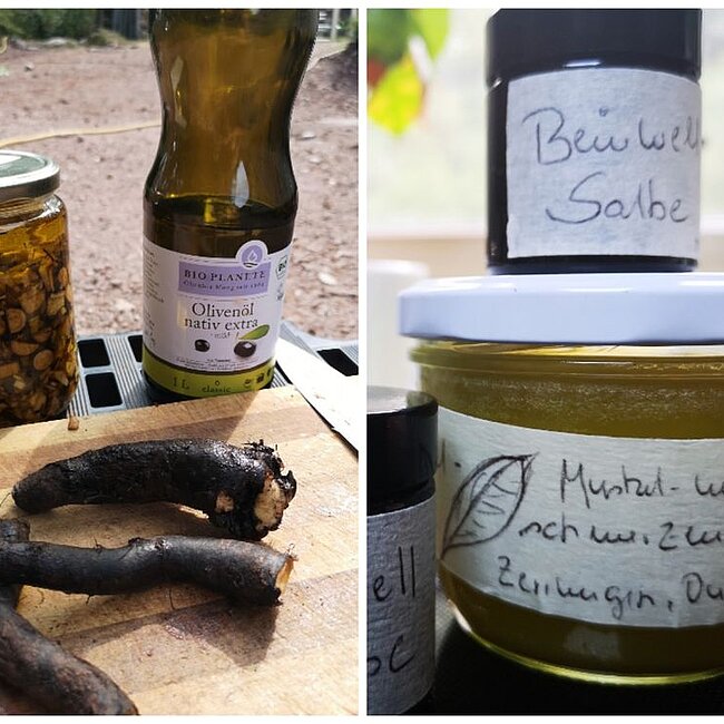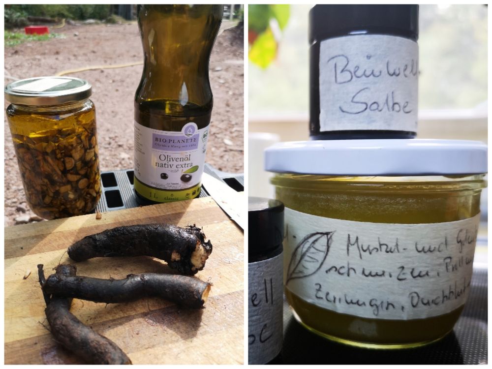 Da die Rückenschmerzen anhalten, habe ich mich in Salbenherstellung versucht. Tolles Ergebnis. Beinwell ist hilfreich bei Muskel- und Gelenkschmerzen. Da kommt die Hexe in mir durch ;)