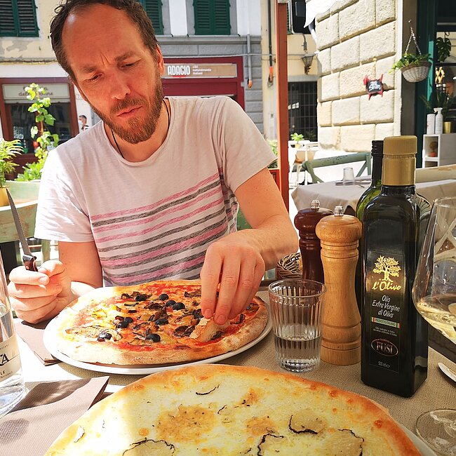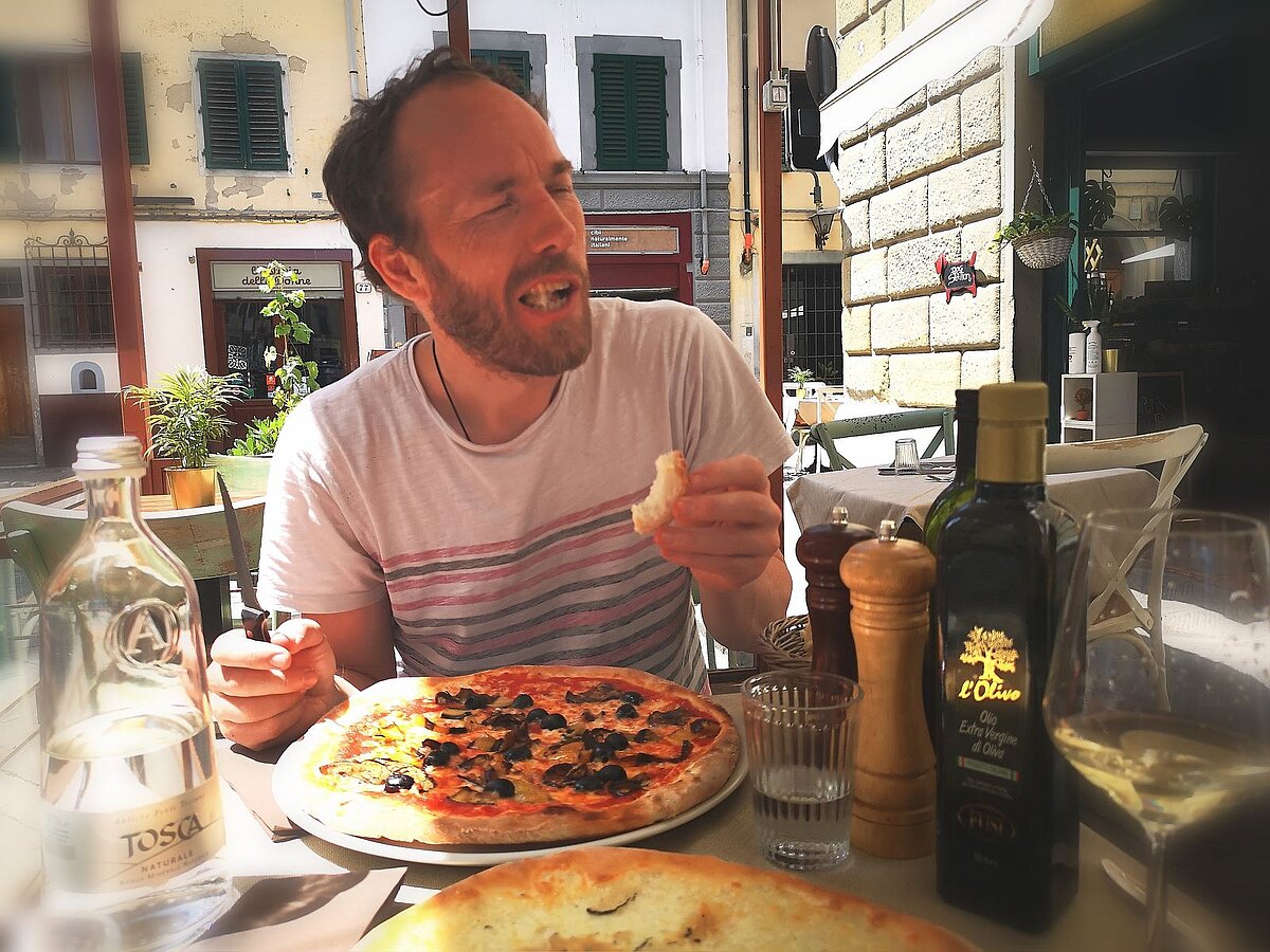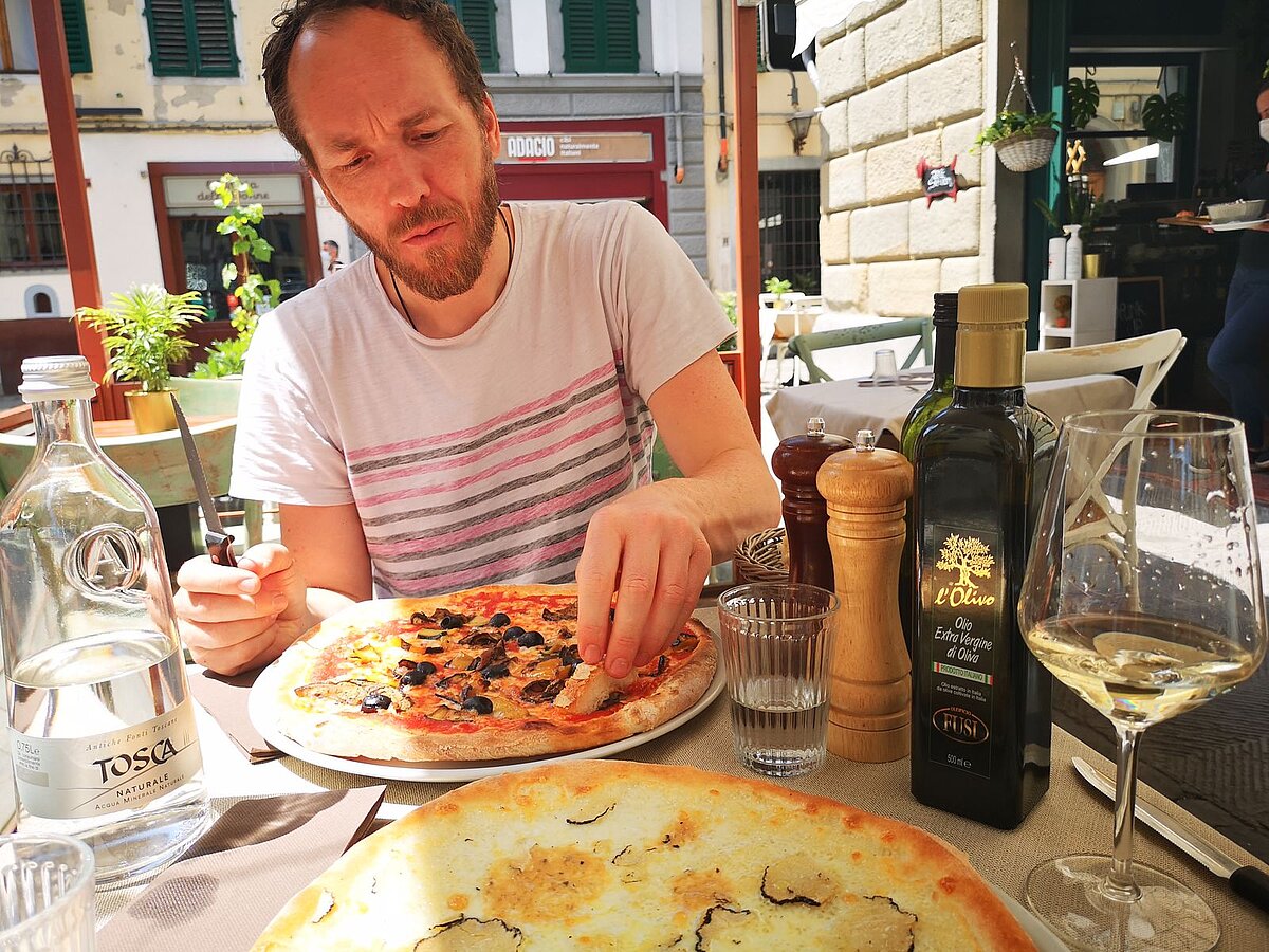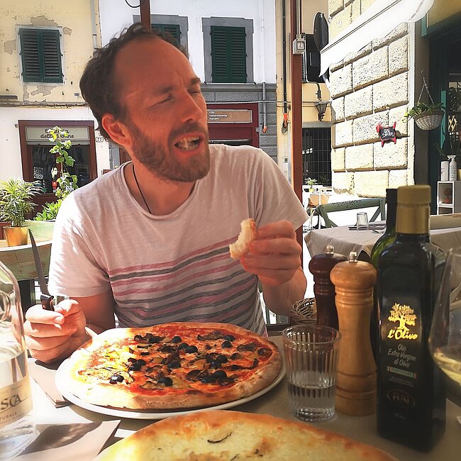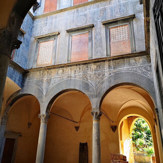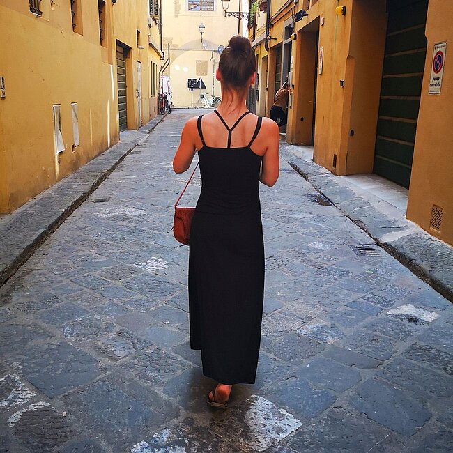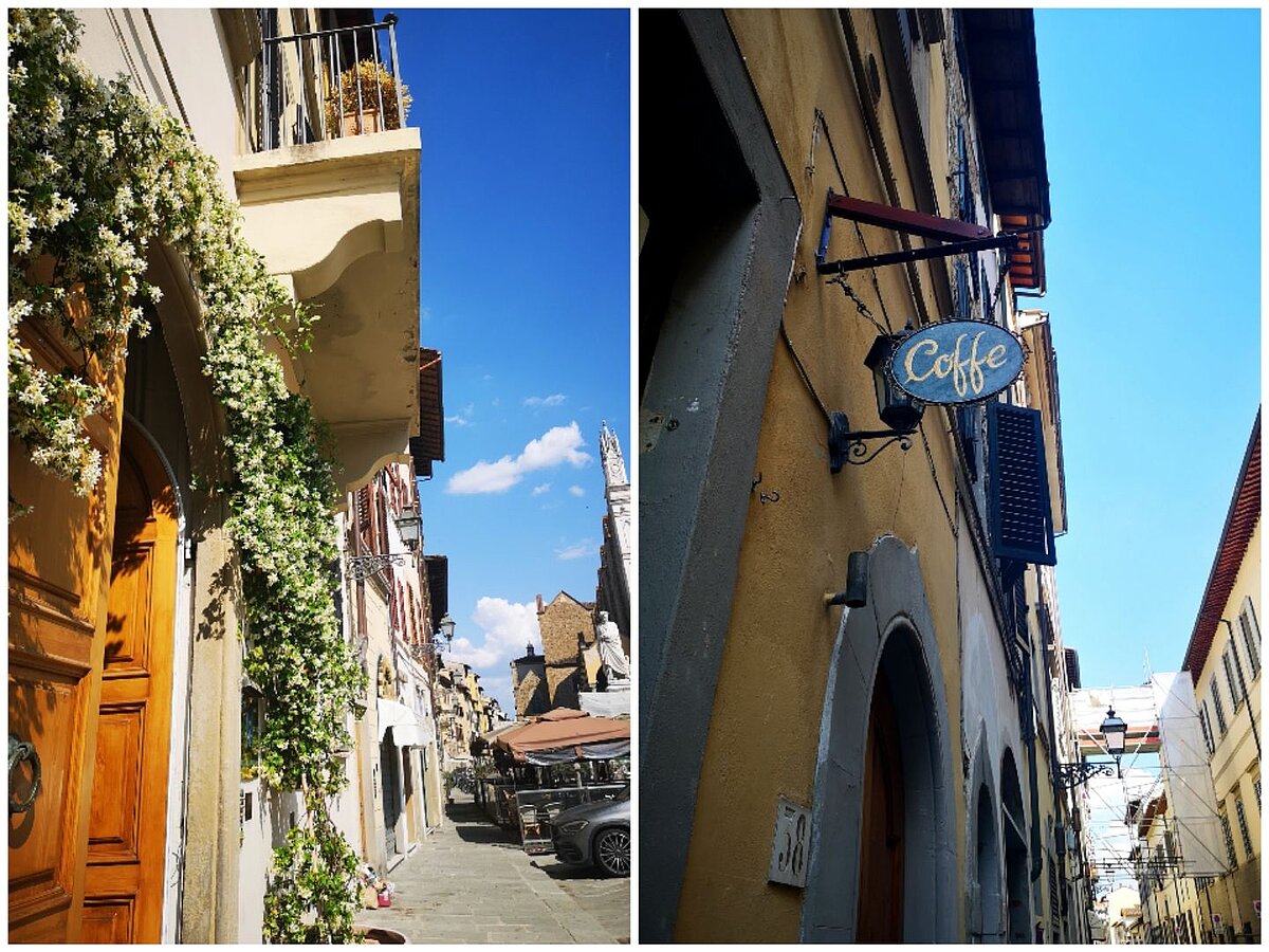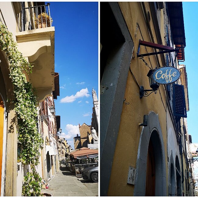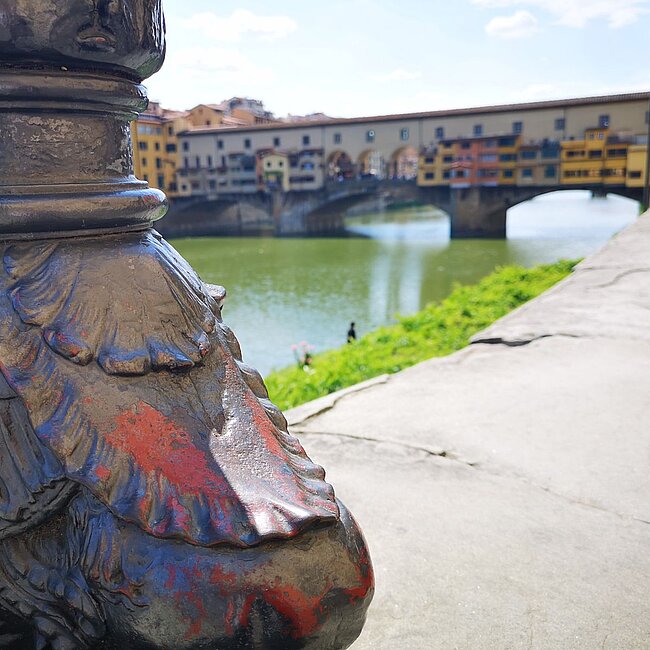 Sie ist eine der wohl berühmtesten und schönsten Brücken der Welt: die Ponte Vecchio in Florenz. Hier im Hintergrund zu sehen. Die Bebauung mit kleinen überhängenden Brückenläden macht die Ponte Vecchio einzigartig. Früher handelten hier hauptsächlich Schlachter mit ihren Waren, aber als die Herzogsfamilie gegen Ende des 16. Jahrhunderts in den nahegelegenen Palazzo Pitti zog, verfügten Sie, dass nur noch Schmuckhändler ihr Geschäft auf der Brücke treiben durften. Denn sie fühlten sich von dem Geruch des Fleisches gestört. Und auch heute noch findet man hauptsächlich Gold- und Silberschmiede in den kleinen Läden auf der Ponte Vecchio.