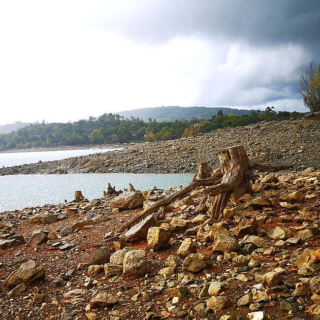 Weiter gehts nach Frankreich....Stellplatz am See mit, naja, etwas neidrigem Wasserspiegel. Wenn da der Mensch nicht wieder seine Finger im Spiel hat.
