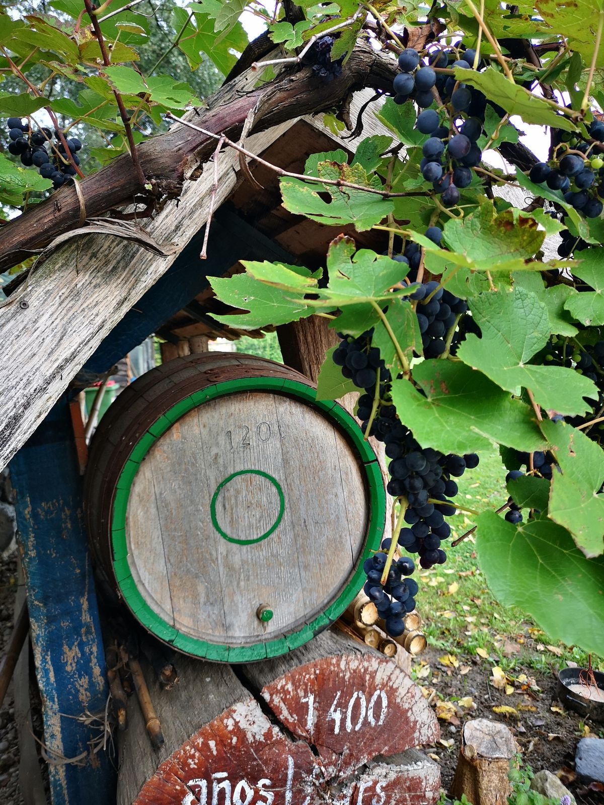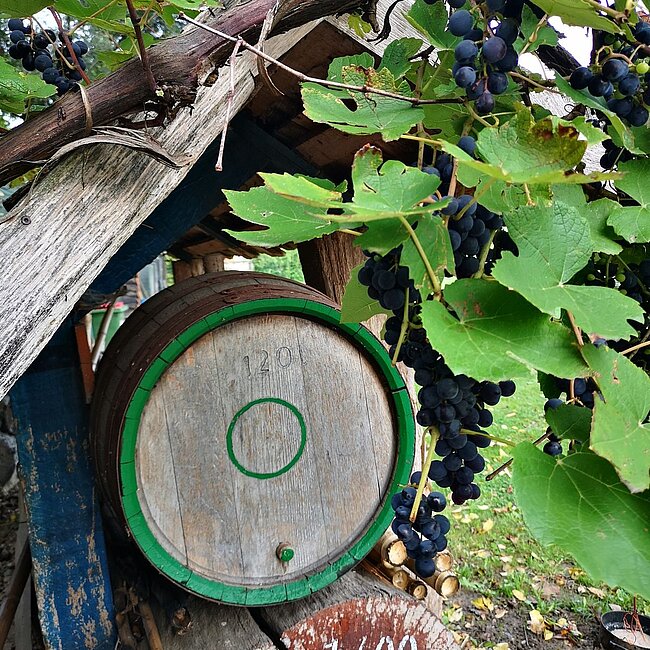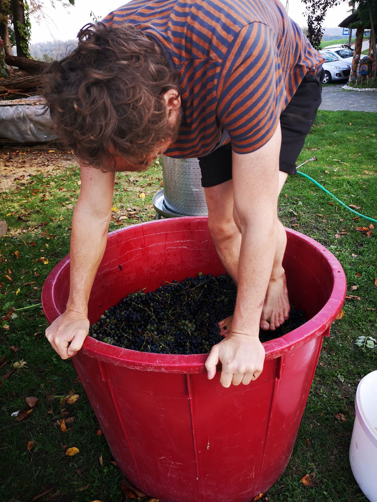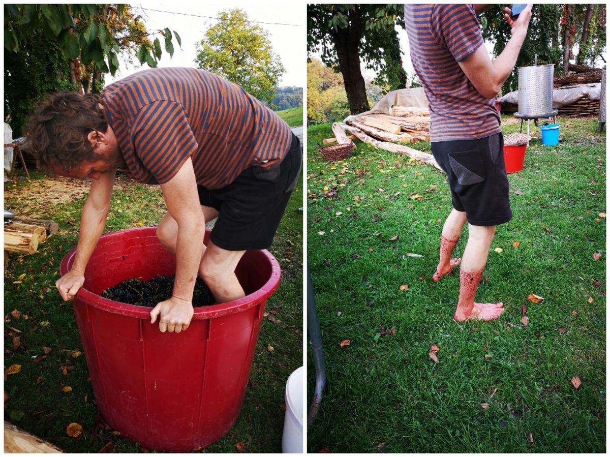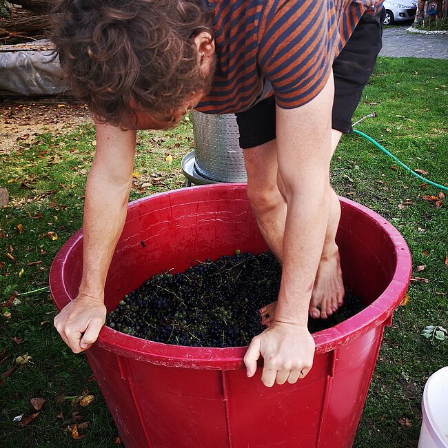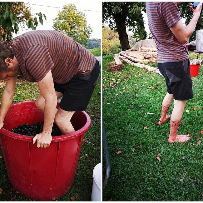 ...so auch für die Trauben. Robert stampft schonmal drauf los.